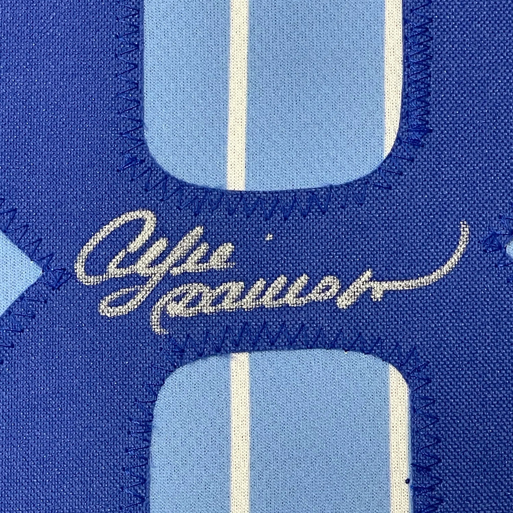 Framed Autographed/Signed Andre Dawson 35x39 Chicago Pinstripe Blue Baseball Jersey JSA COA