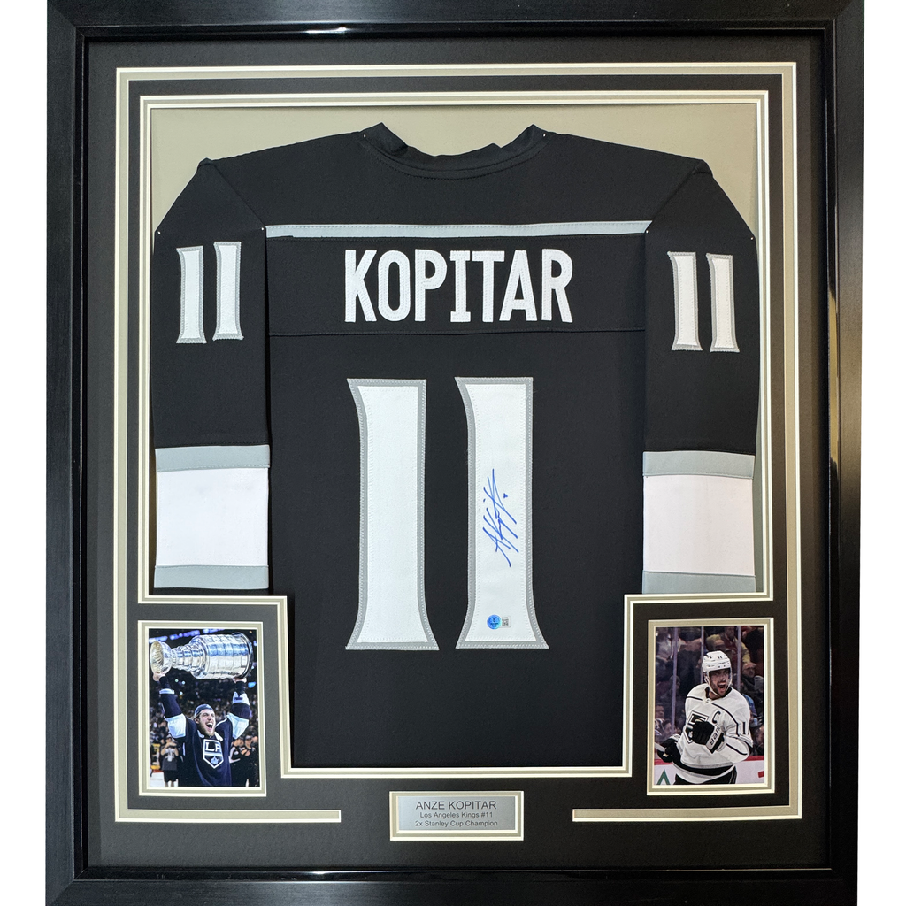Framed Autographed/Signed Anze Kopitar 35x39 Los Angeles LA Black Hockey Jersey JSA COA