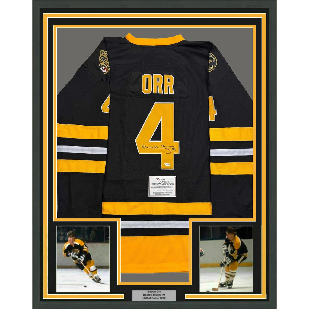 Framed Autographed/Signed Bobby Orr 35x39 Boston Bruins Black Hockey Jersey Fanatics COA
