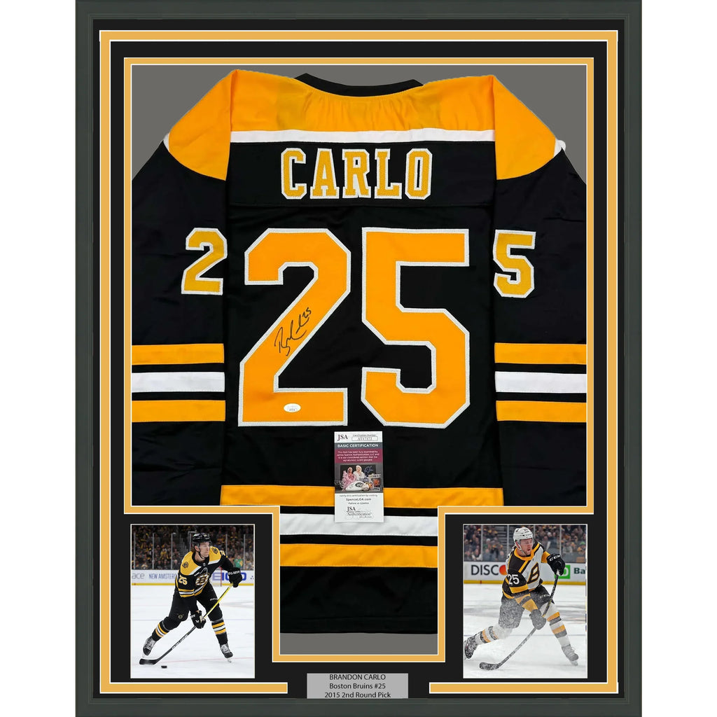 Framed Autographed/Signed Brandon Carlo 35x39 Boston Black Hockey Jersey JSA COA