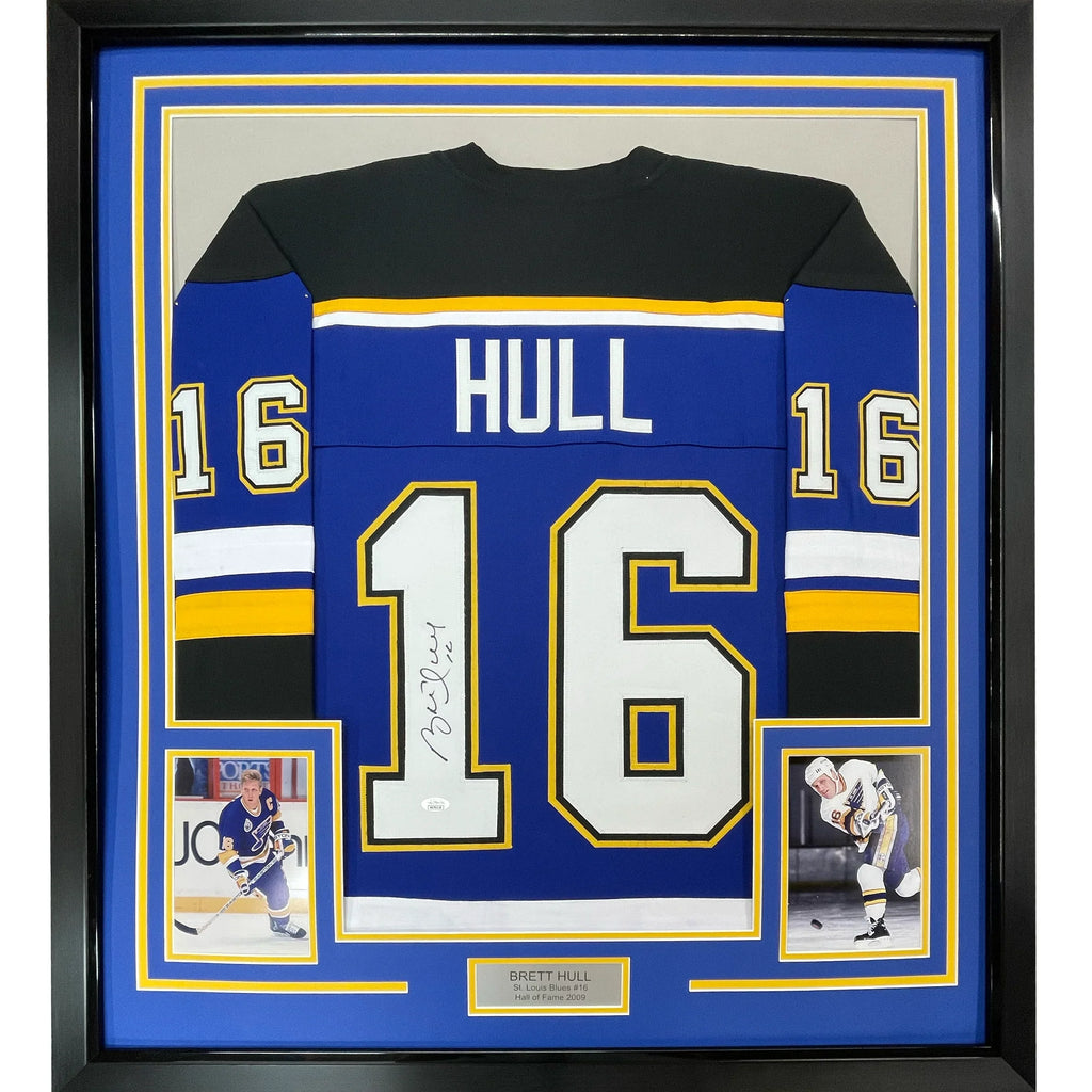 Framed Autographed/Signed Brett Hull 35x39 St. Louis Blue White Numbers Hockey Jersey JSA COA
