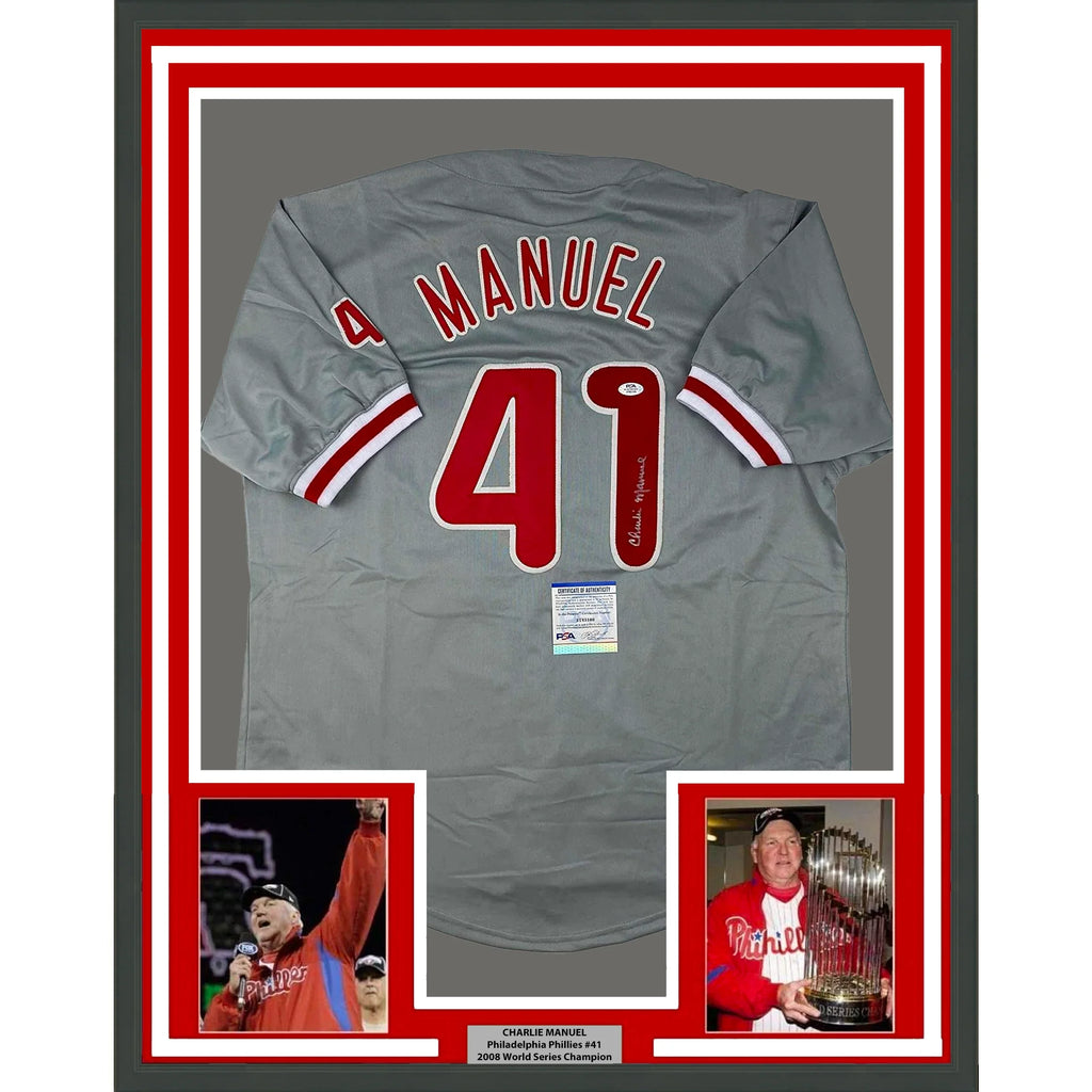 Framed Autographed/Signed Charlie Manuel 35x39 Philadelphia Grey Baseball Jersey PSA/DNA COA