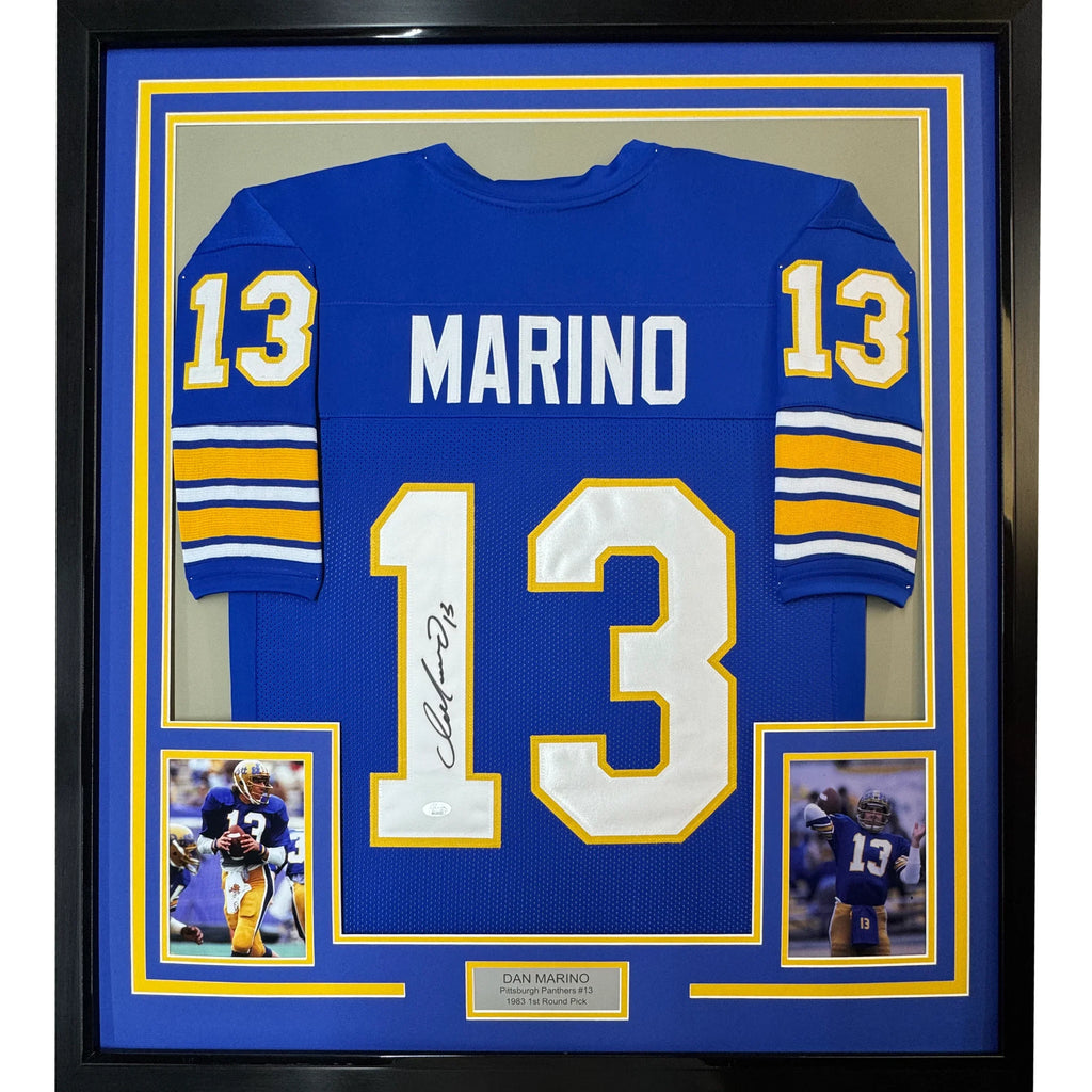 Framed Autographed/Signed Dan Marino 35x39 Pittsburgh Blue College Football Jersey JSA COA