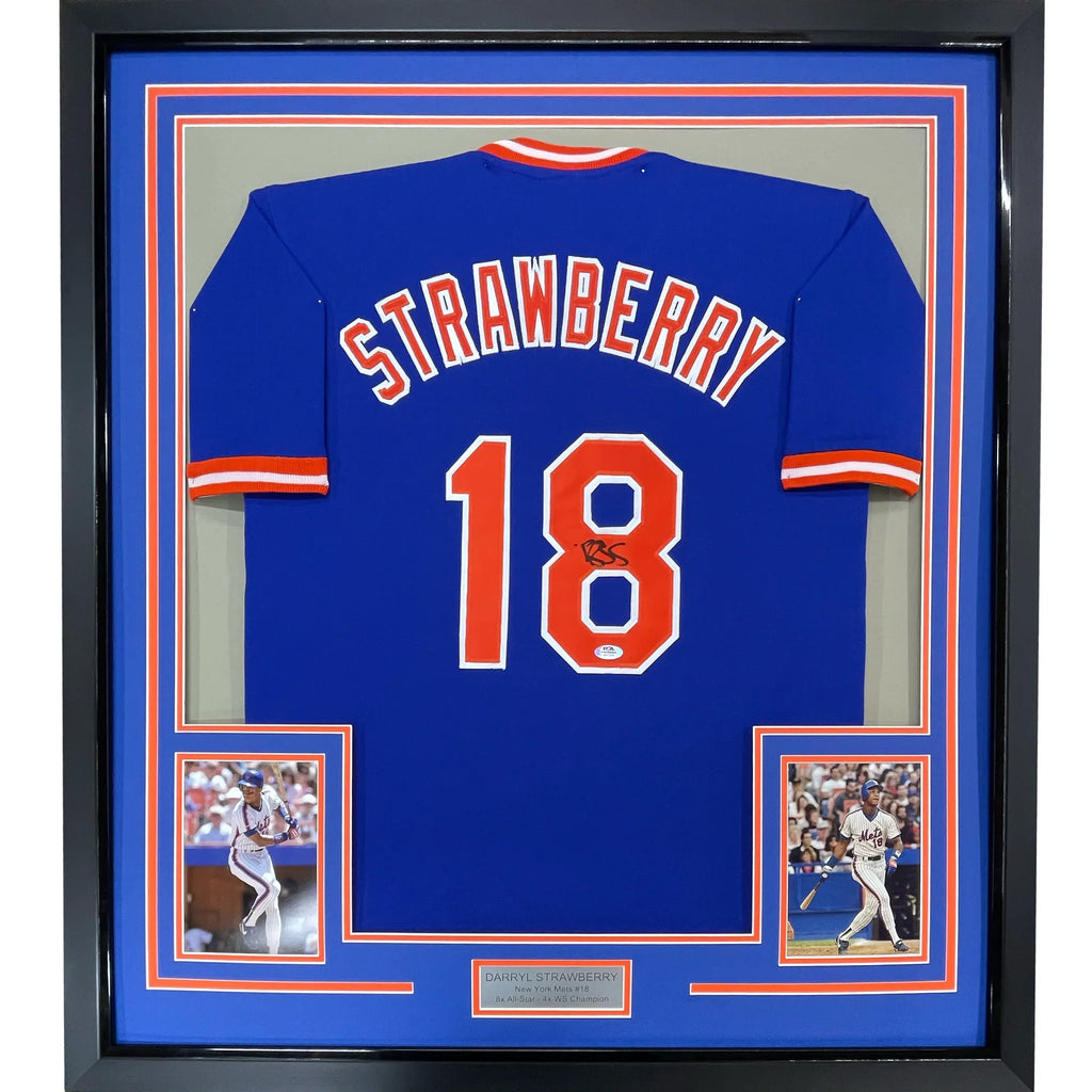 Framed Autographed/Signed Darryl Strawberry 35x39 New York Blue Baseball Jersey PSA/DNA COA