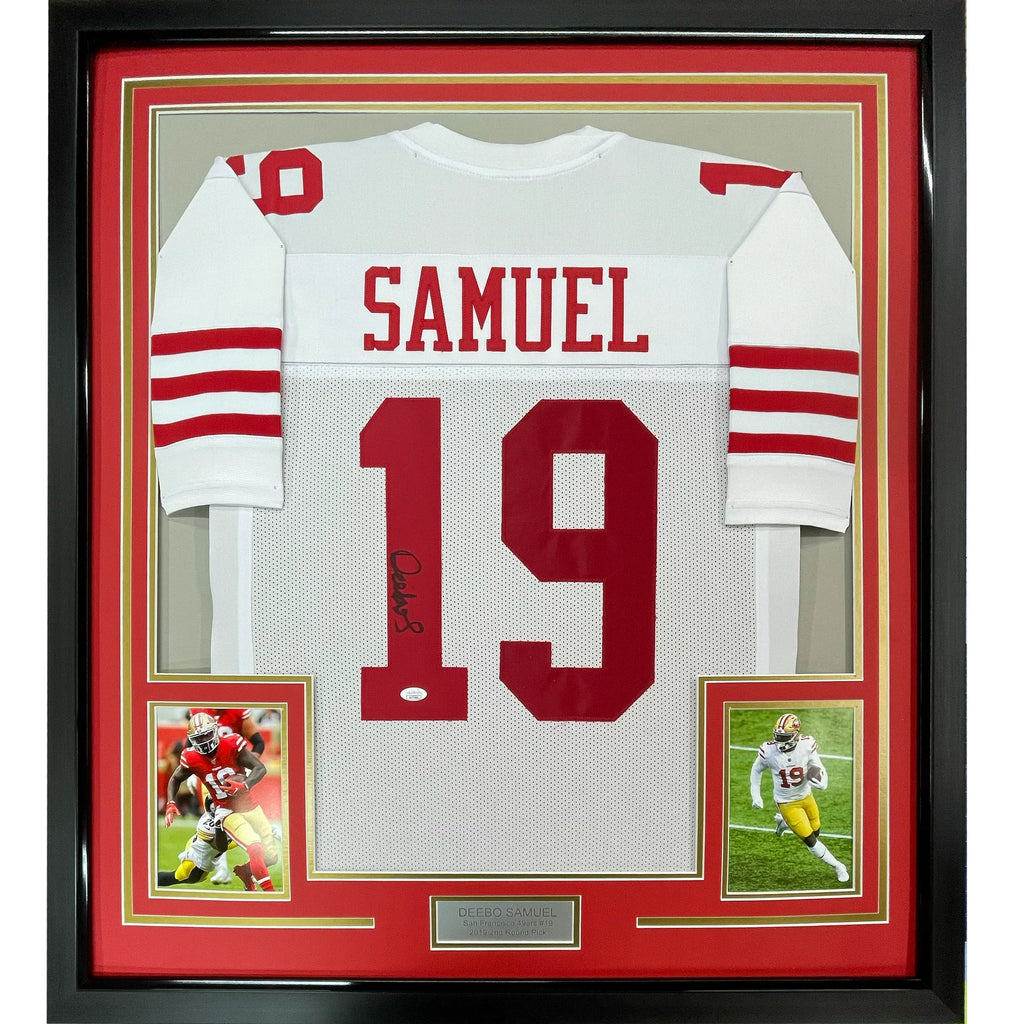 Framed Autographed/Signed Deebo Samuel 35x39 San Francisco White Football Jersey JSA COA