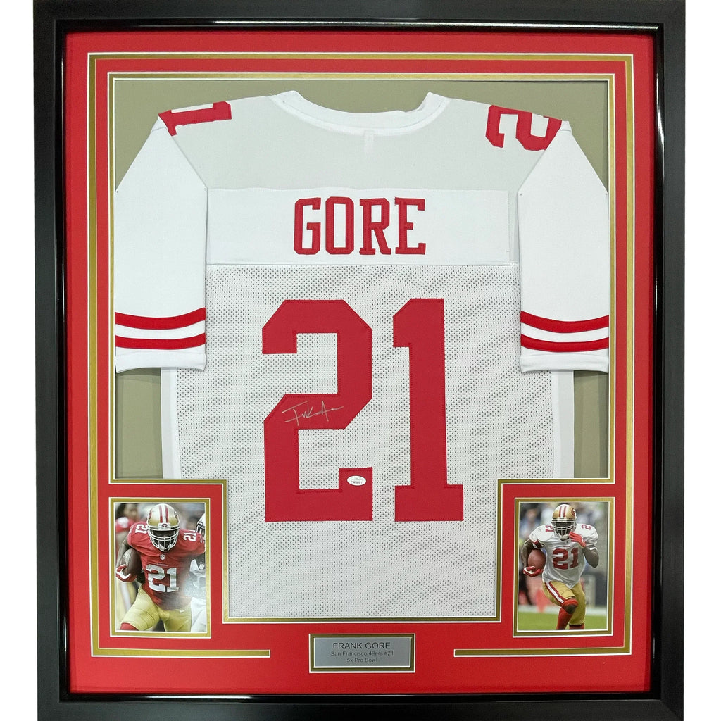 Framed Autographed/Signed Frank Gore 35x39 San Francisco White Football Jersey Beckett BAS COA