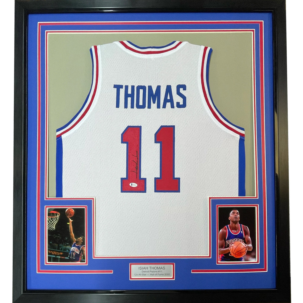 Framed Autographed/Signed Isiah Thomas 35x39 Detroit White Basketball Jersey Beckett BAS COA