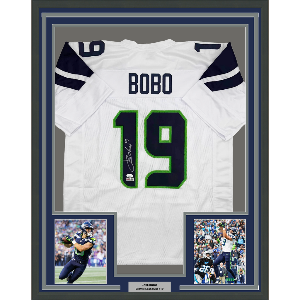 Framed Autographed/Signed Jake Bobo 35x39 Seattle White Football Jersey JSA COA