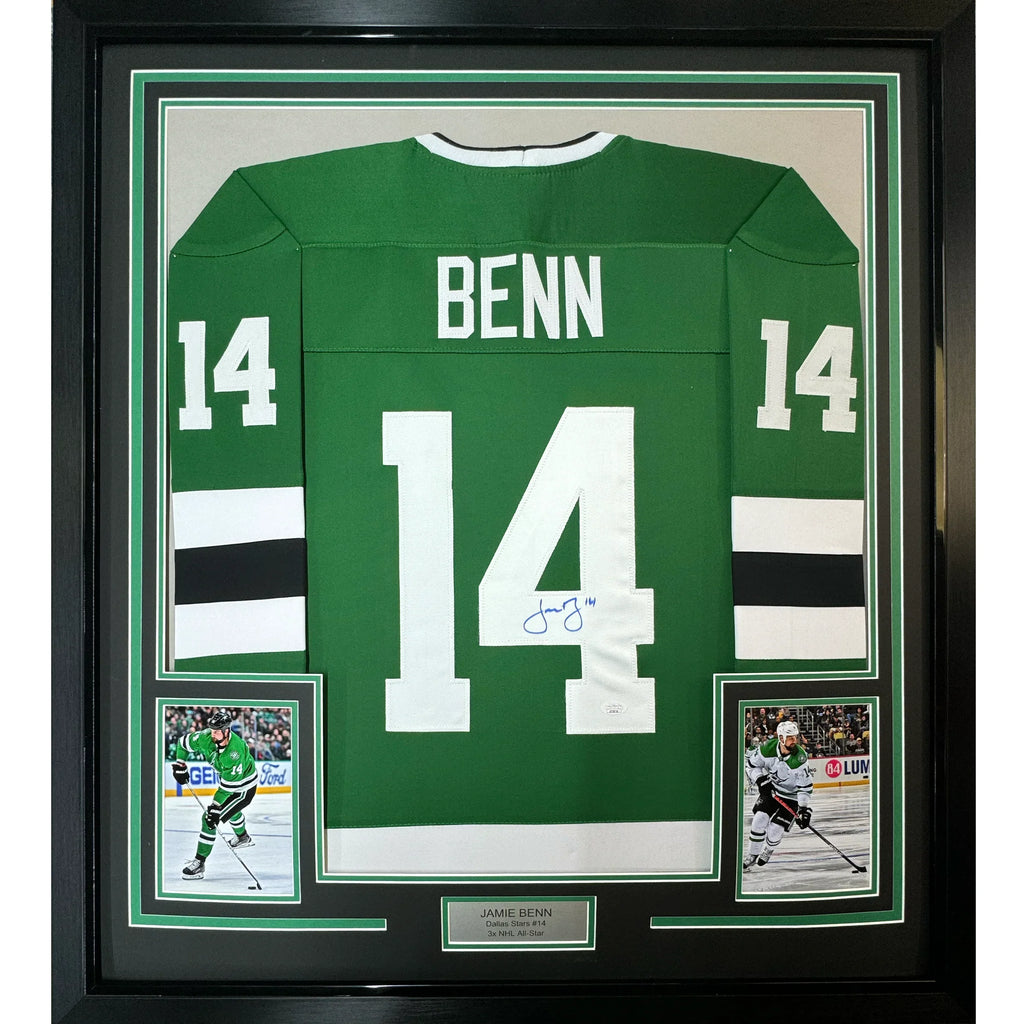 Framed Autographed/Signed Jamie Benn 35x39 Dallas Green Retro Hockey Jersey JSA COA