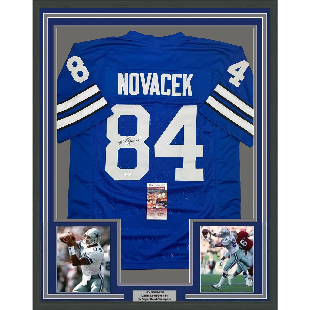 Framed Autographed/Signed Jay Novacek 35x39 Dallas Blue Football Jersey JSA COA