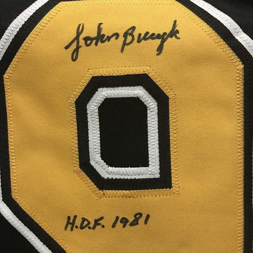 Framed Autographed/Signed John Johnny Bucyk HOF 1981 35x39 Boston Black Hockey Jersey JSA COA
