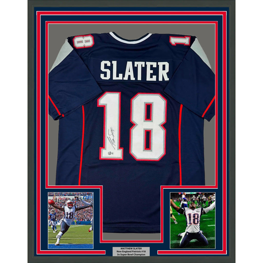 Framed Autographed/Signed Matthew Slater 35x39 New England Blue Football Jersey Beckett BAS COA
