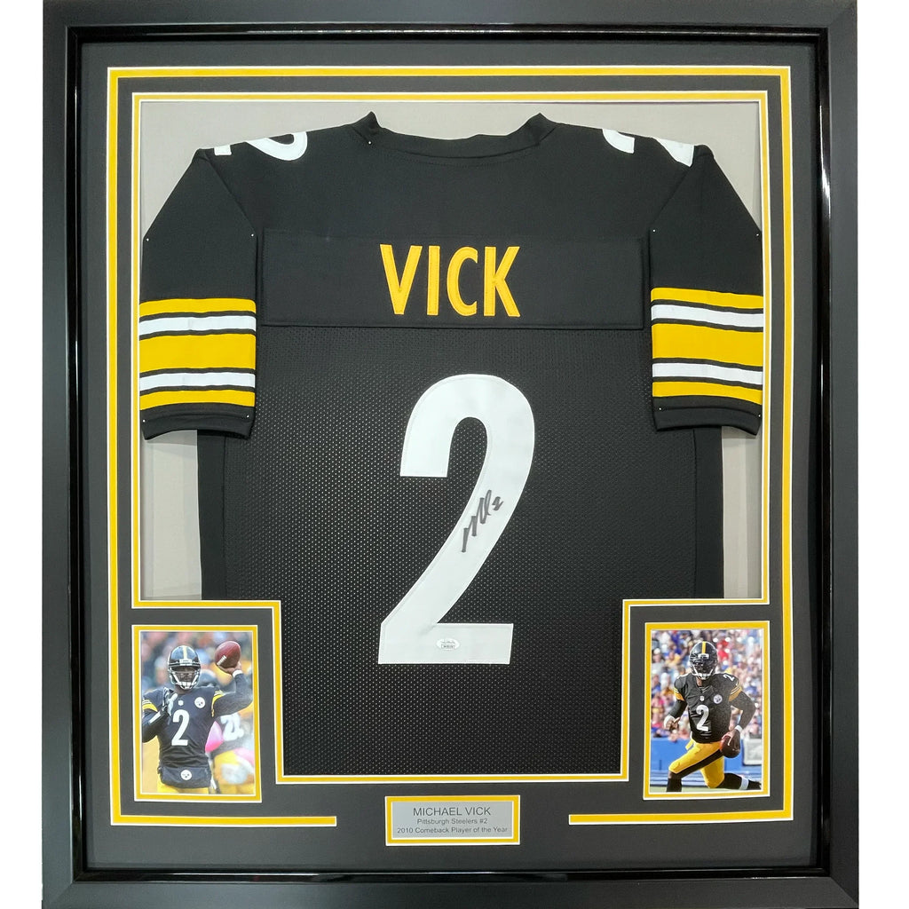 Framed Autographed/Signed Michael Mike Vick 35x39 Pittsburgh Black Football Jersey JSA COA