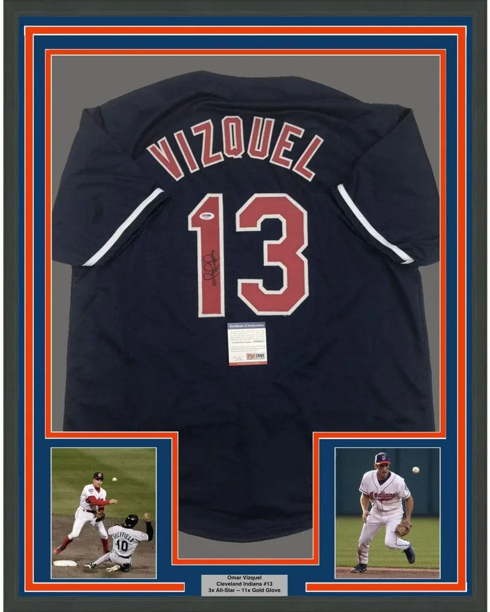 Framed Autographed/Signed Omar Vizquel 35x39 Cleveland Blue Baseball Jersey PSA/DNA COA