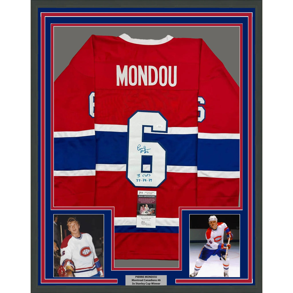 Framed Autographed/Signed Pierre Mondou "3 Cups 77-78-79" 35x39 Montreal Red Hockey Jersey JSA COA