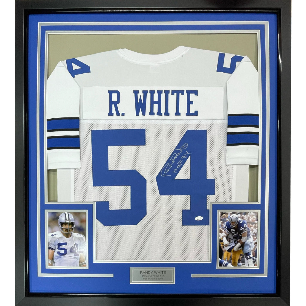 Framed Autographed/Signed Randy White HOF 94 35x39 Dallas White Football Jersey JSA COA