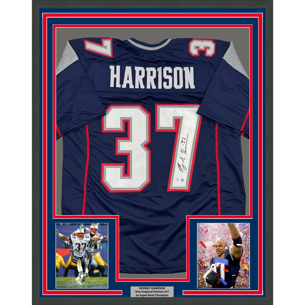 Framed Autographed/Signed Rodney Harrison 35x39 New England Blue Football Jersey Beckett BAS COA