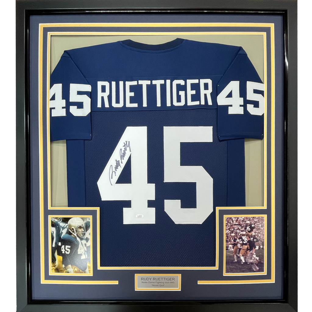 Framed Autographed/Signed Rudy Ruettiger 35x39 Notre Dame Blue College Football Jersey JSA COA