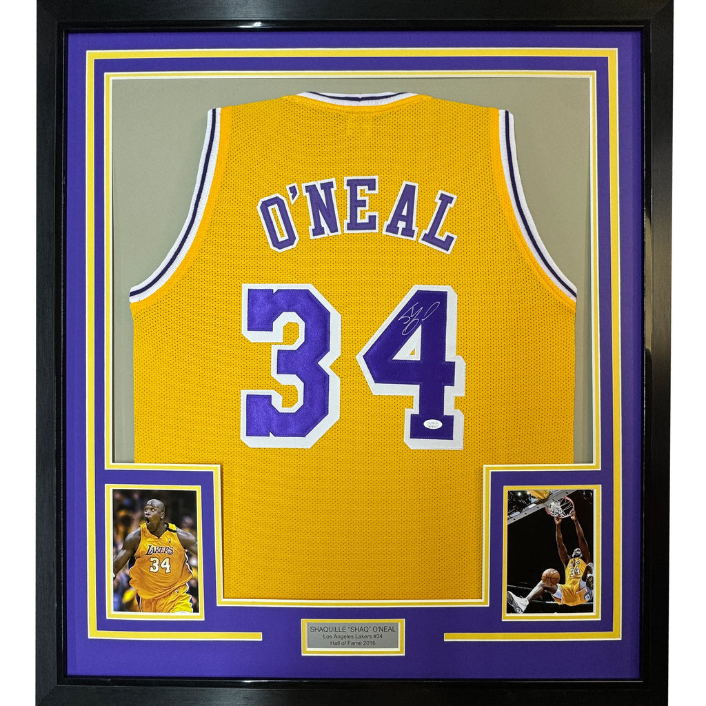 Framed Autographed/Signed Shaquille Shaq O'Neal 35x39 Los Angeles LA Yellow Basketball Jersey Beckett BAS COA