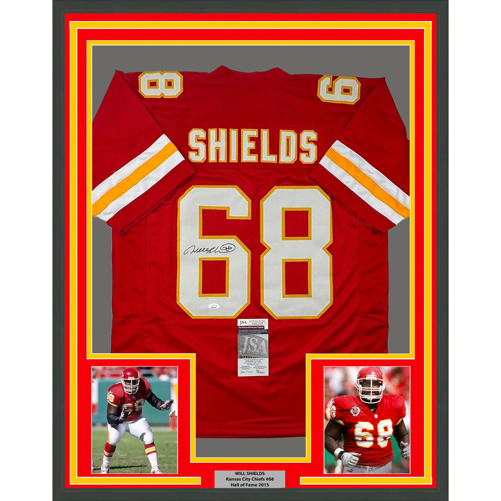 Framed Autographed/Signed Will Shields 35x39 Kansas City Red Football Jersey JSA COA