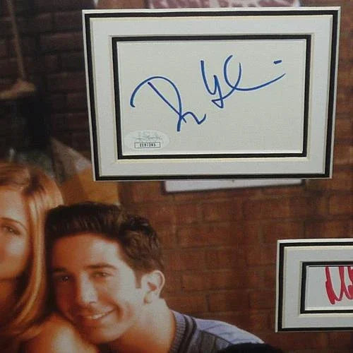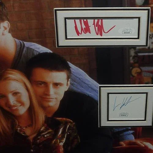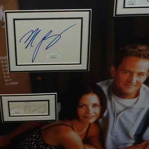 Experience the ultimate collector's item with our deluxe framed Friends poster - featuring the full-size TV poster and autographs from the entire cast (Jennifer Aniston, Courtney Cox, Lisa Kudrow, David Schwimmer, Matthew Perry and Matt LeBlanc)! Certified by JSA, this poster is a must-have for any true fan. Display it proudly in your home or office and relive your favorite moments! Total frame dimensions are 34x44.