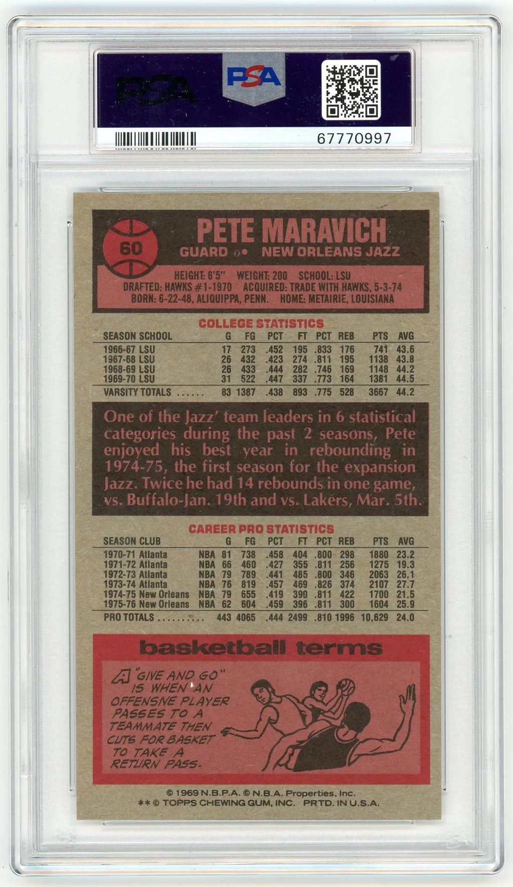 Graded 1976 Topps Pistol Pete Maravich #60 Basketball Card PSA 8 NM-MT