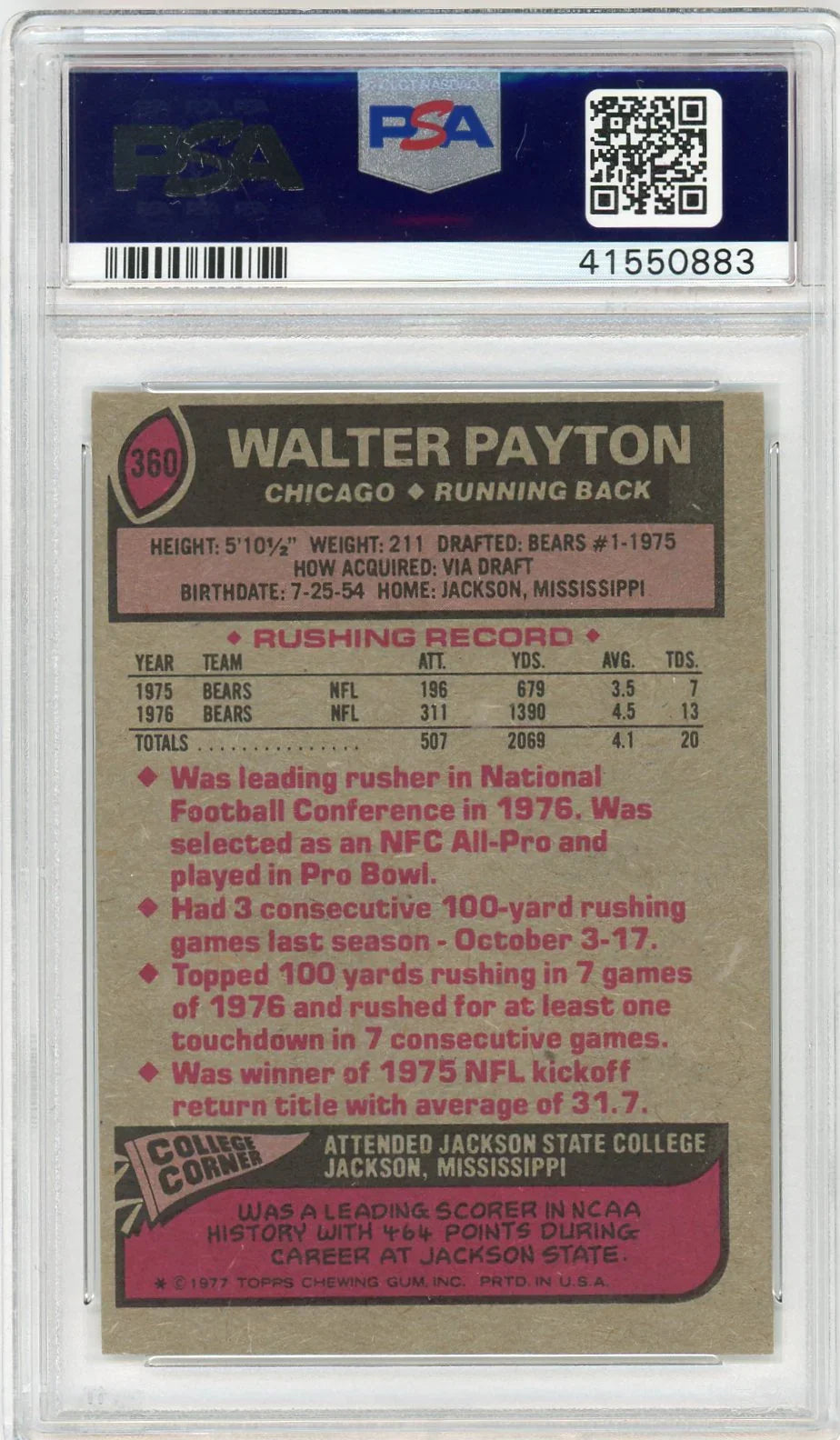 Graded 1977 Topps Walter Payton #360 2nd Year Football Card PSA 6 EX-MT