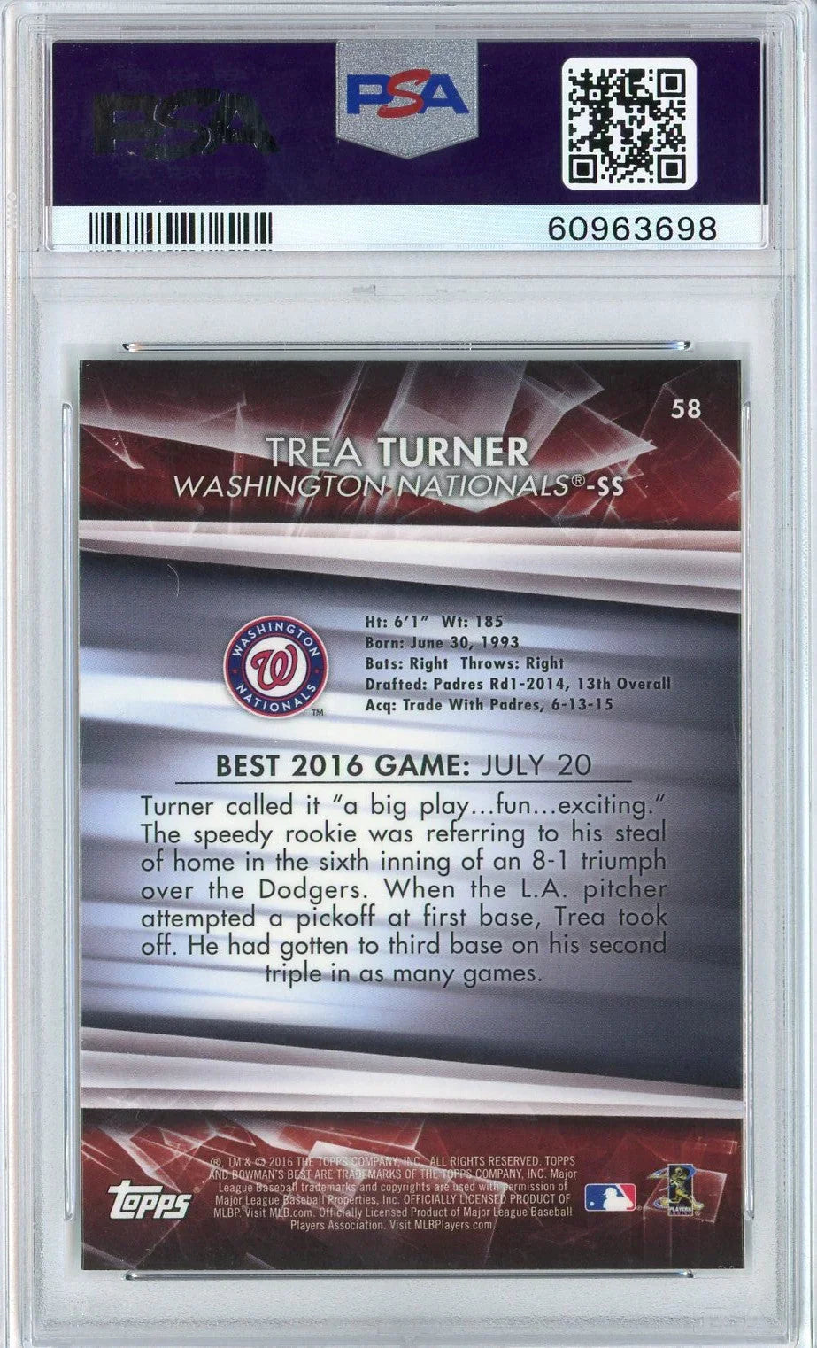 Graded 2016 Bowman's Best Trea Turner #58 Rookie RC Baseball Card PSA 10 Gem Mint