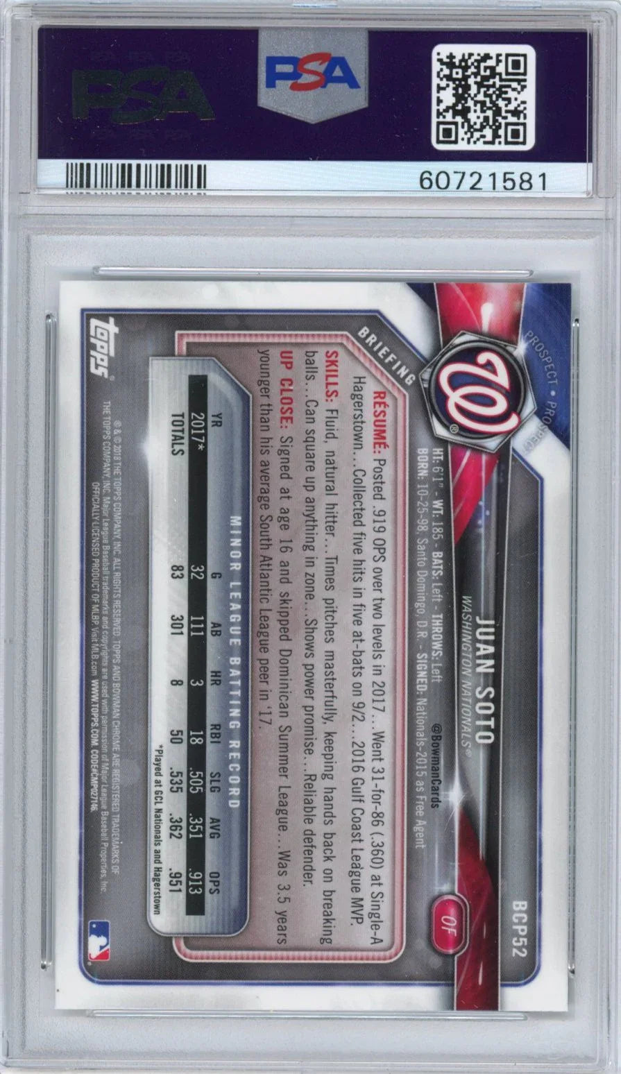 Graded 2018 Topps Bowman Juan Soto #52 Prospects Chrome Rookie RC Baseball Card PSA 10 Gem Mint