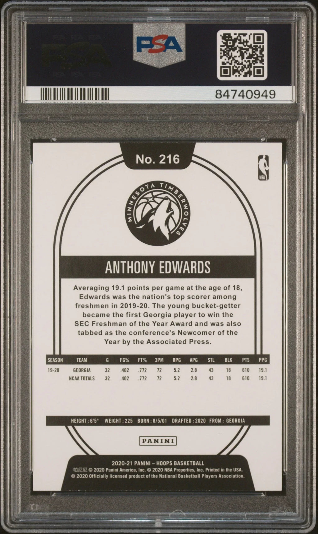 Graded 2020-21 Panini Hoops Anthony Edwards #216 Purple Explosion Rookie RC Basketball Card PSA 10 Gem Mint