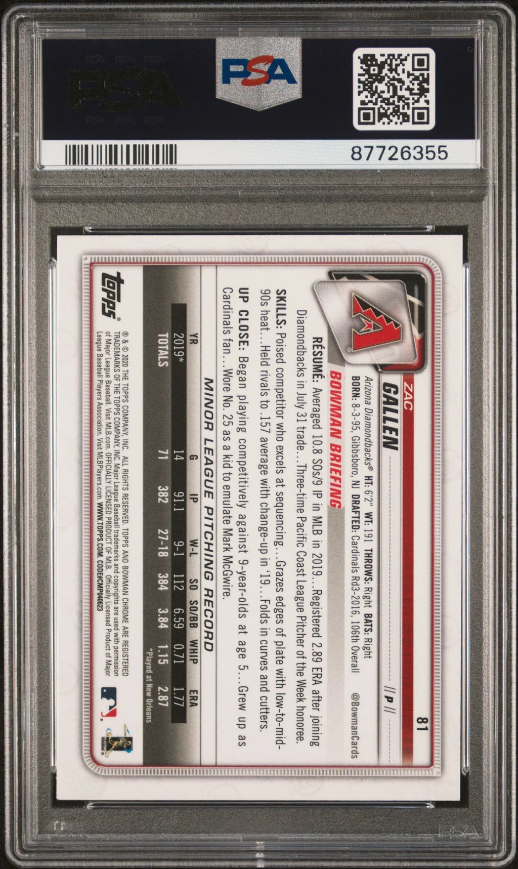 Graded 2020 Topps Bowman Chrome Zac Gallen #81 Rookie RC Baseball Card PSA 10 Gem Mint