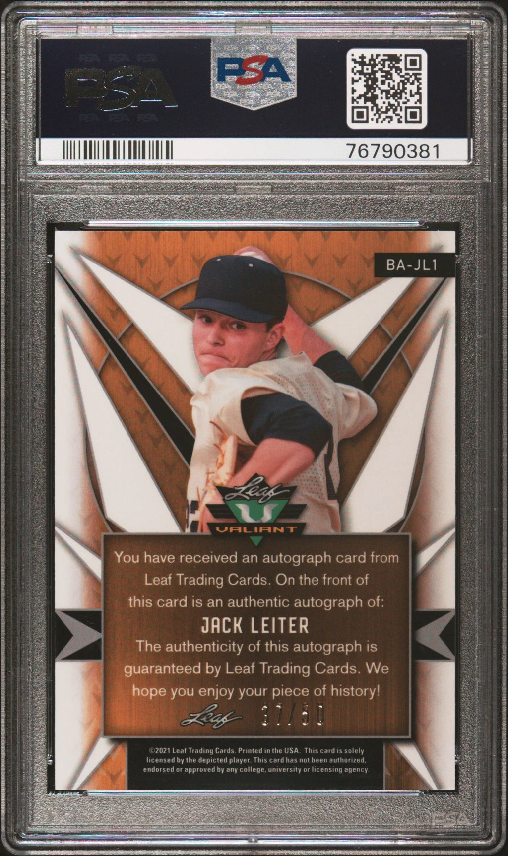 Graded 2021 Leaf Valiant Jack Leiter #BAJL1 Autograph Purple #/50 Rookie RC Baseball Card PSA 10 Gem Mint