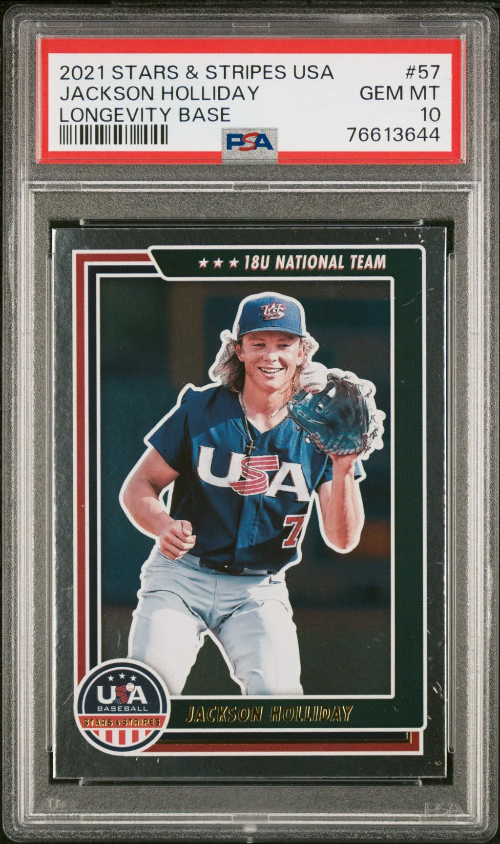 Graded 2021 Panini Stars & Stripes USA Jackson Holliday #57 Longevity Base Rookie RC Baseball Card PSA 10 Gem Mint