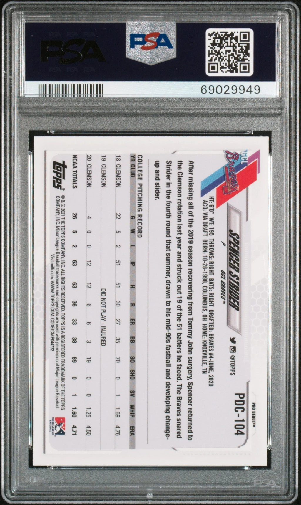 Graded 2021 Topps Pro Debut Spencer Strider #PDC104 Chrome Rookie RC Baseball Card PSA 10 Gem Mint