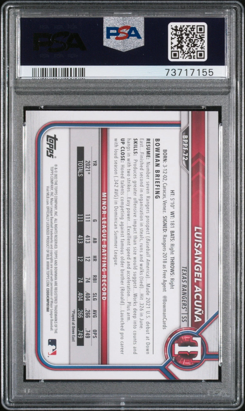 Graded 2022 Topps Bowman 1st Edition Luisangel Acuna #BPPF72 Sky Blue Foil Rookie RC Baseball Card PSA 10 Gem Mint