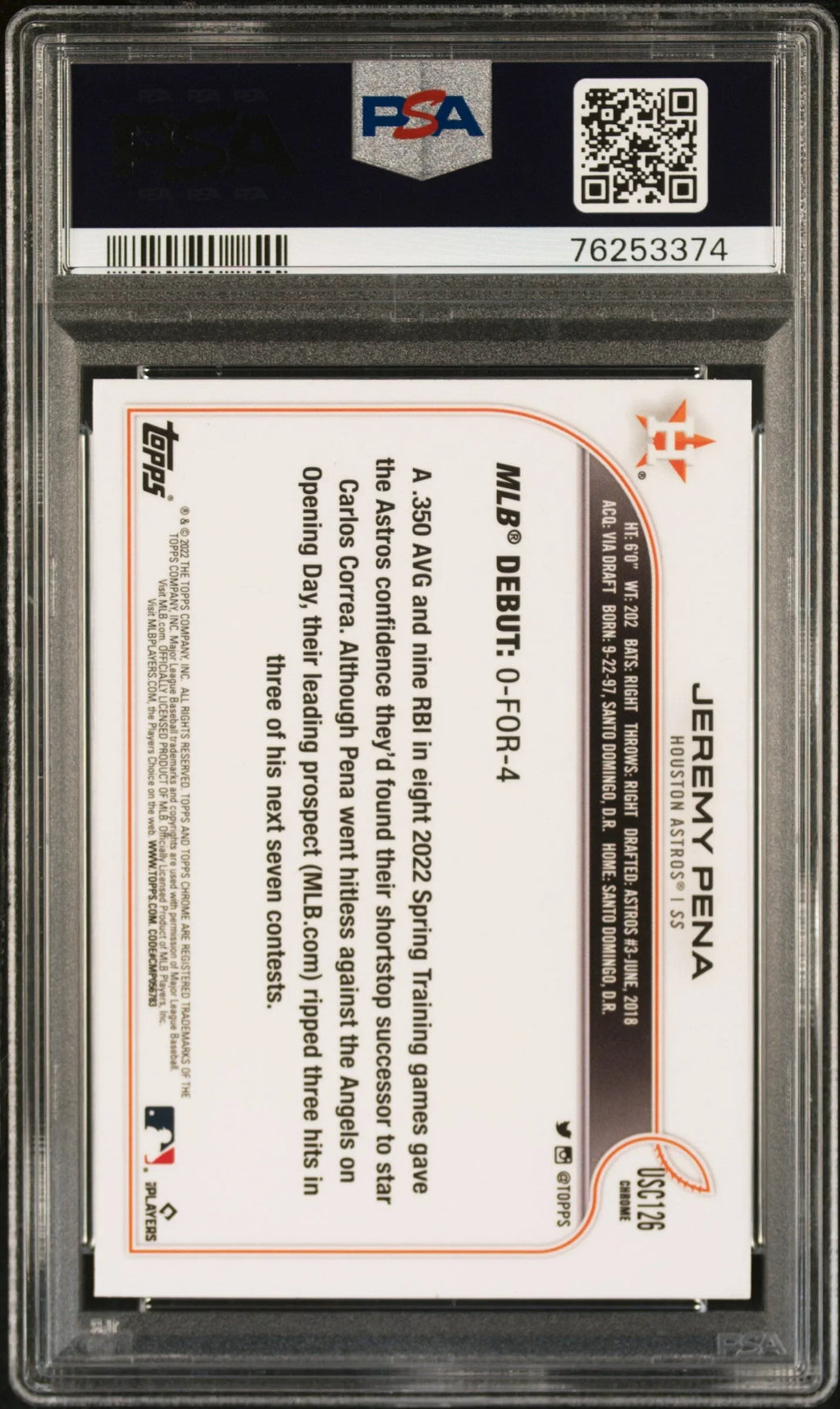 Graded 2022 Topps Chrome Update Jeremy Pena #USC126 Purple Refractor Rookie RC Baseball Card PSA 10 Gem Mint