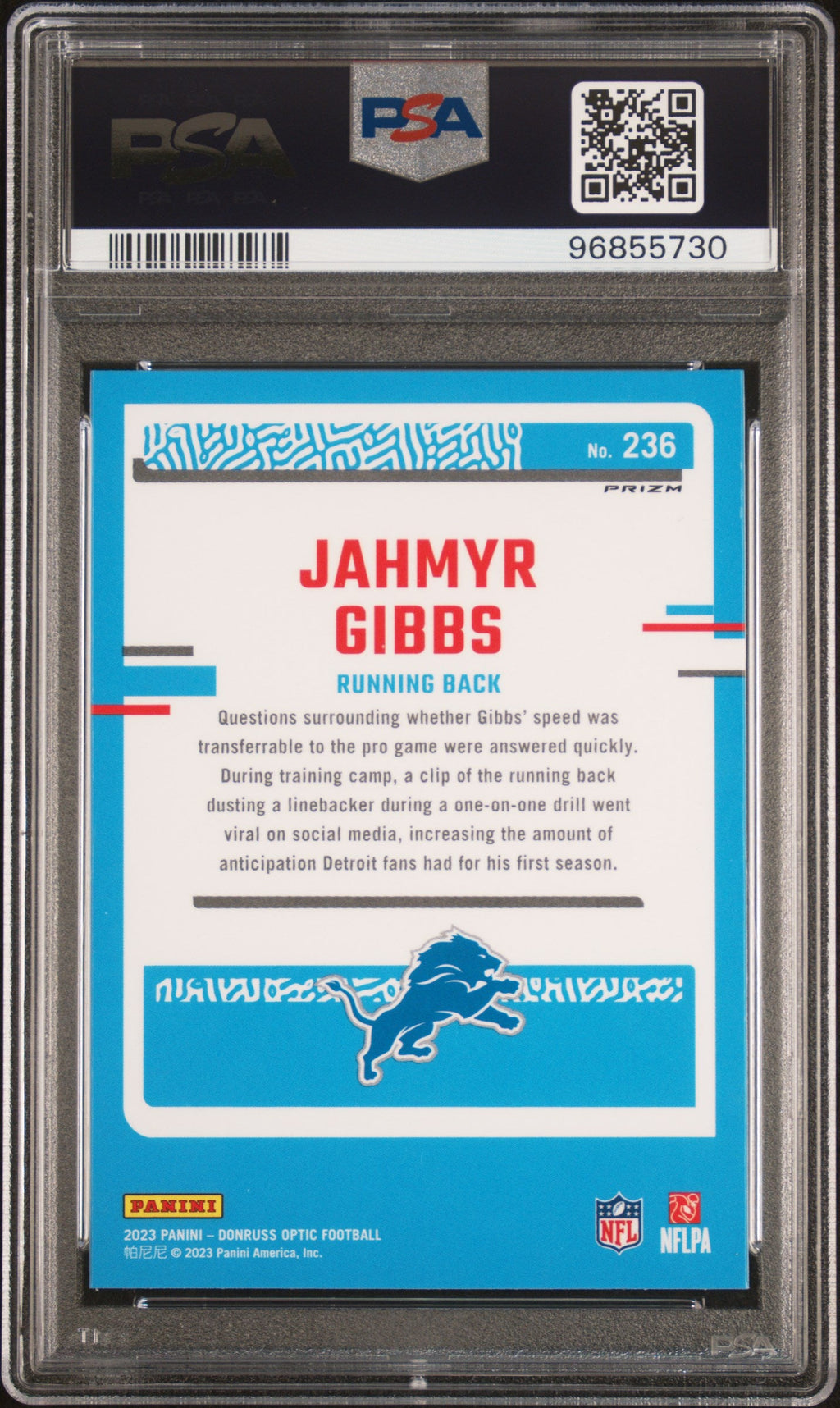 Graded 2023 Panini Donruss Optic Jahmyr Gibbs #236 Green Velocity Rookie RC Football Card PSA 10 Gem Mint