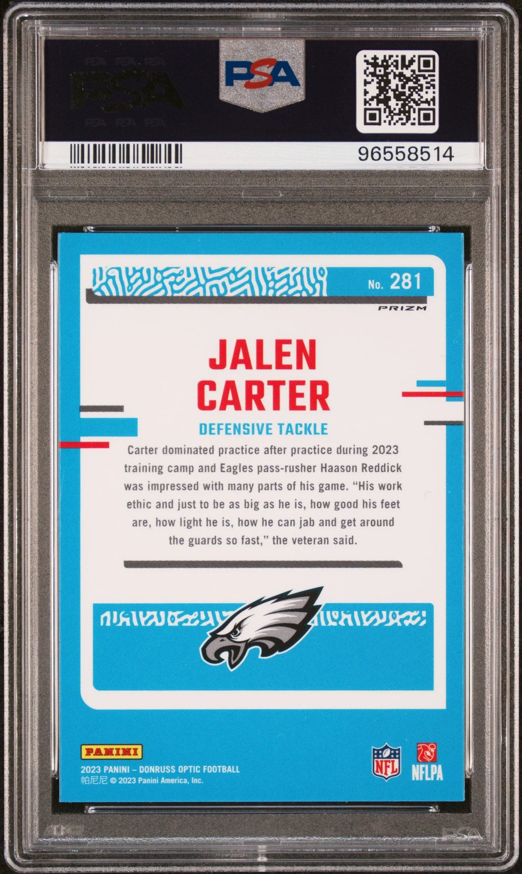 Graded 2023 Panini Donruss Optic Jalen Carter #281 Green Hyper Rookie RC Football Card PSA 10