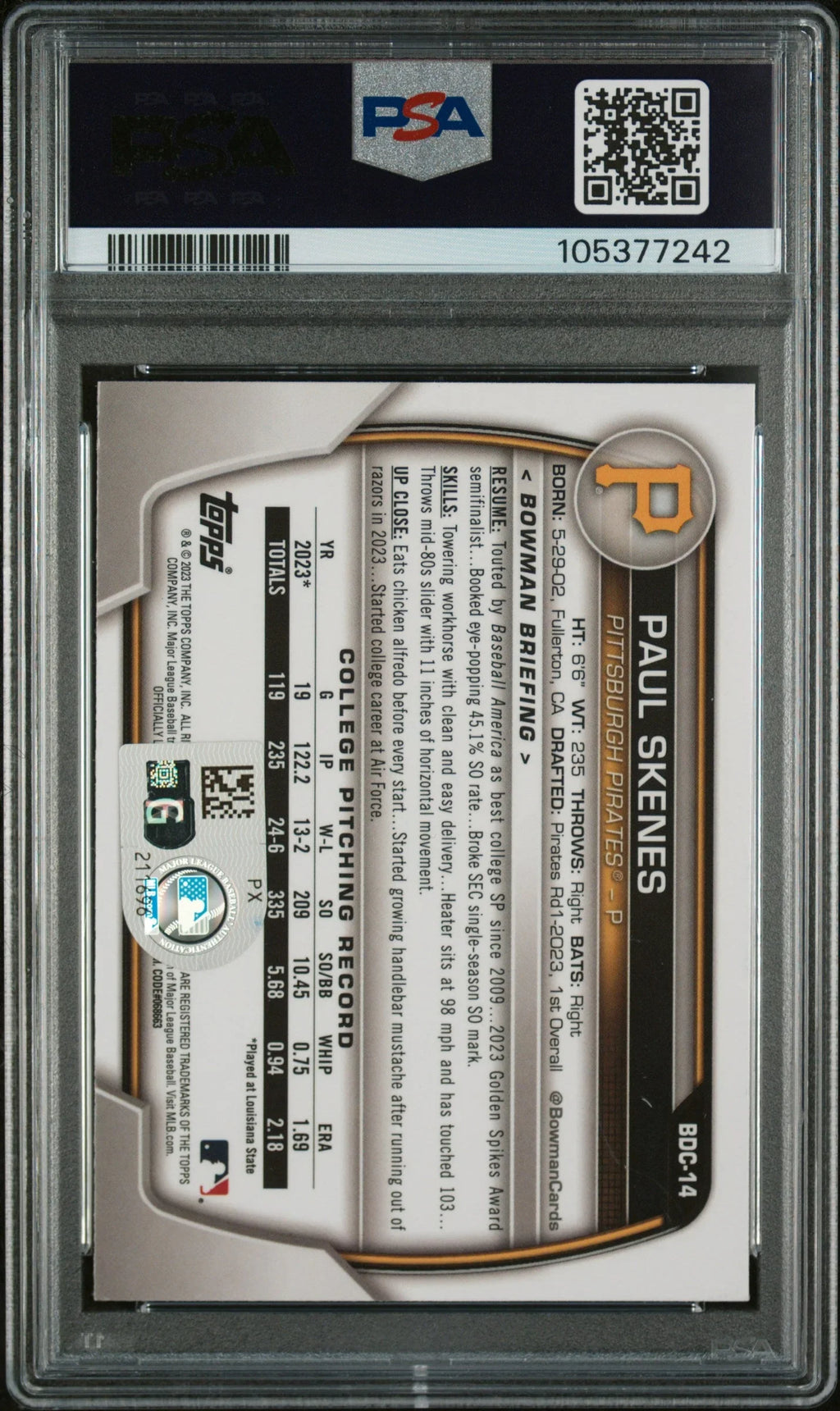 Graded 2023 Topps Bowman Draft Paul Skenes #BDC14 Chrome Rookie RC Baseball Card PSA Authentic Auto