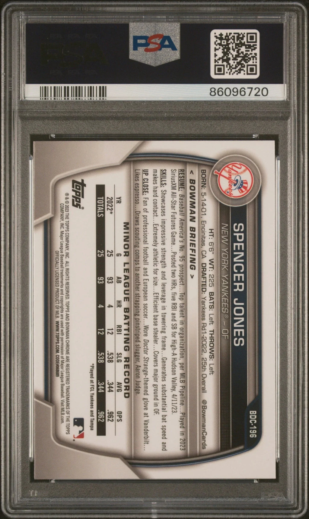 Graded 2023 Topps Bowman Draft Spencer Jones #BDC196 Chrome Rookie RC Baseball Card PSA 10 Gem Mint