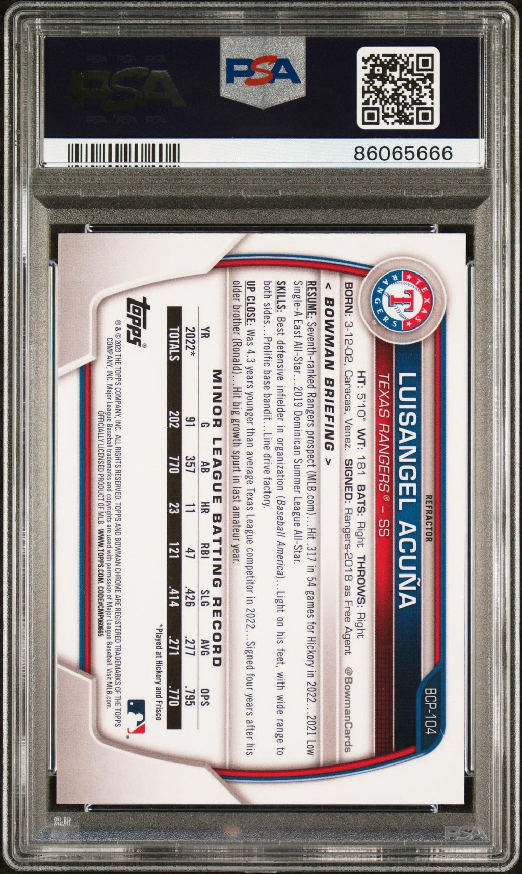 Graded 2023 Topps Bowman Luisangel Acuna #BCP104 Chrome Prospects Lunar Glow Refractor Rookie RC Baseball Card PSA 10 Gem Mint