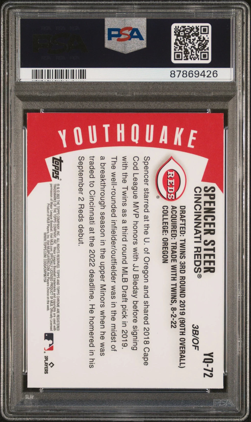 Graded 2023 Topps Chrome Spencer Steer #YQ72 Youthquake Rookie RC Baseball Card PSA 10 Gem Mint