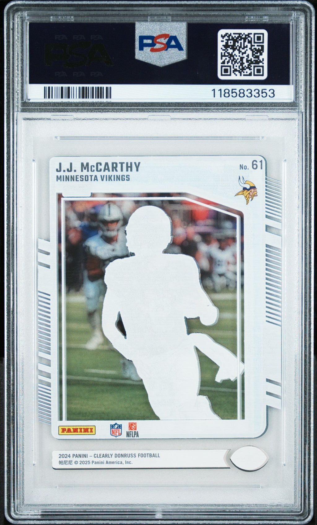 Graded 2024 Panini Clearly Donruss JJ McCarthy #61 Rookie RC Football Card PSA 10 Gem Mint