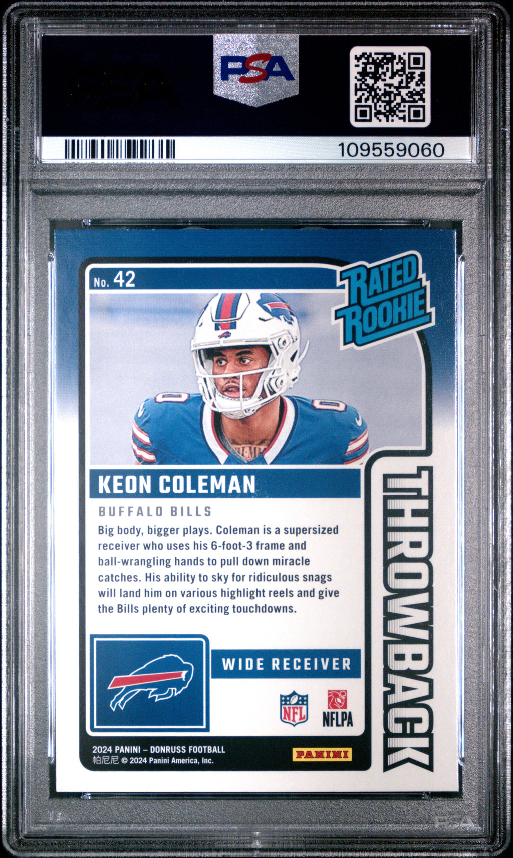 Graded 2024 Panini Donruss Keon Coleman #42 Rated Rookies Throwback Rookie RC Football Card PSA 10 Gem Mint