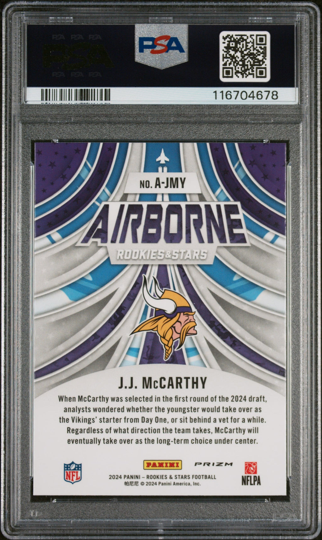 Graded 2024 Panini Rookies & Stars JJ McCarthy #AJMY Airborne Red Plaid Rookie RC Football Card PSA 10 Gem Mint