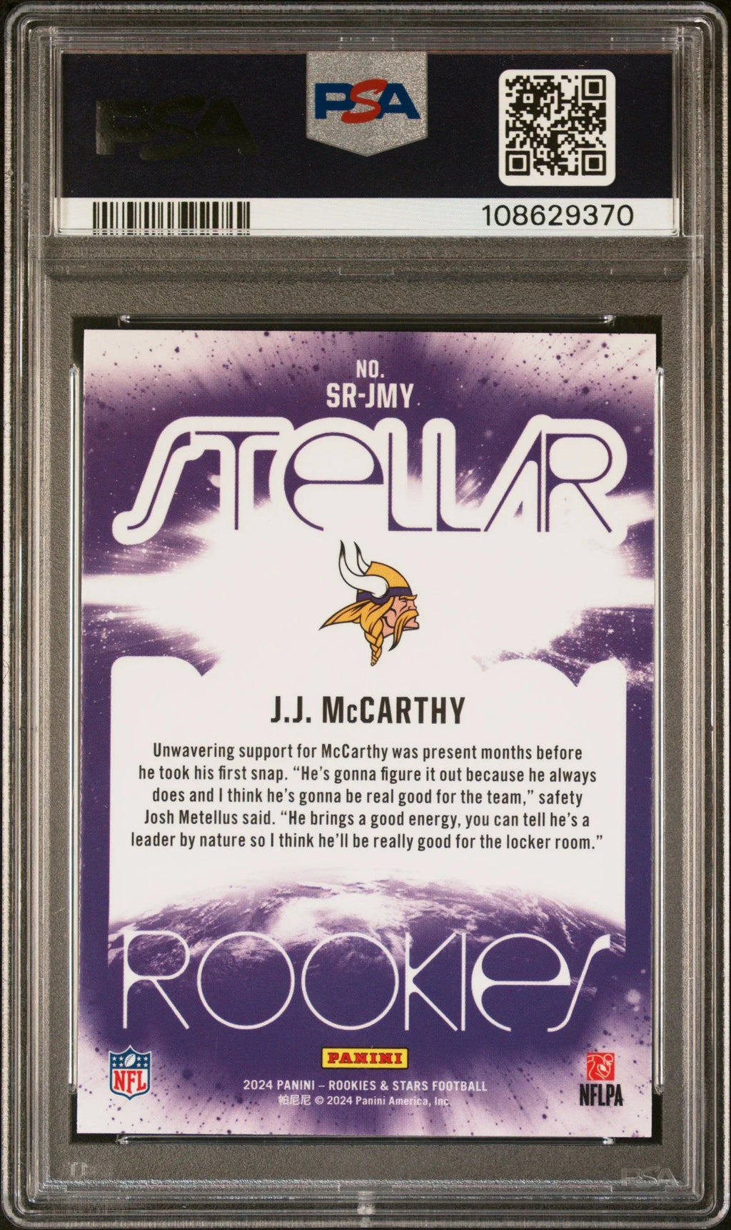 Graded 2024 Panini Rookies & Stars JJ McCarthy #SRJMY Stellar Rookies Rookie RC Football Card PSA 10 Gem Mint