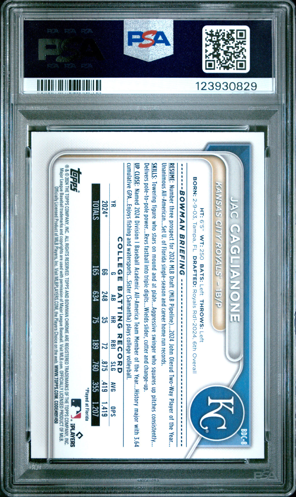 Graded 2024 Topps Bowman Draft Jac Caglianone #BDC8 Chrome Rookie RC Baseball Card PSA 9 Mint