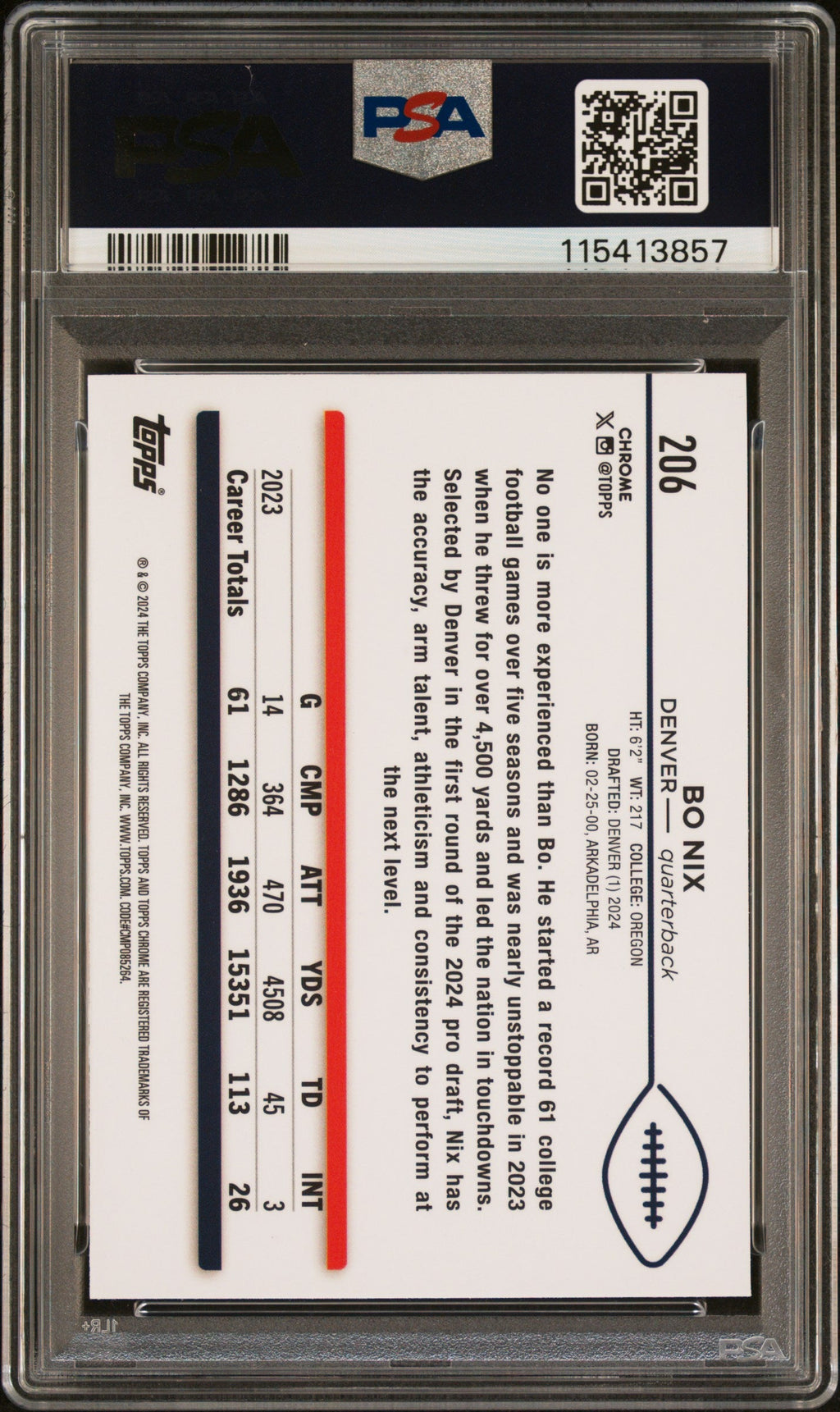 Graded 2024 Topps Chrome Bo Nix #206 Rookie RC Football Card PSA 10 Gem Mint