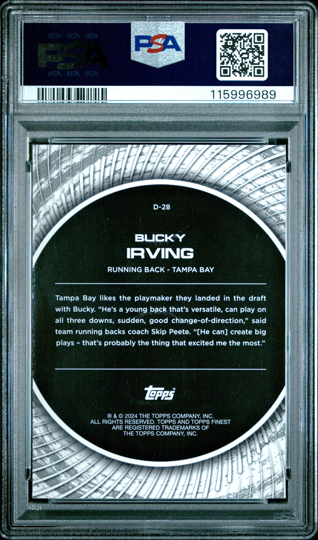 Graded 2024 Topps Finest Bucky Irving #D28 Debut Purple Refractor /125 Rookie RC Football Card PSA 10 Gem Mint