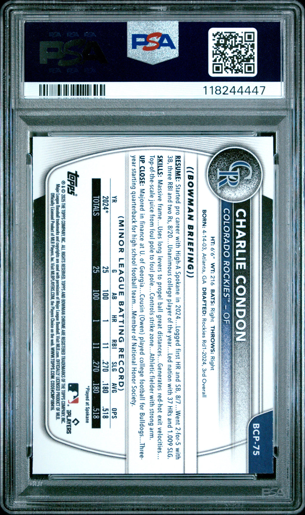 Graded 2025 Topps Bowman Charlie Condon #BCP75 Chrome Prospects Rookie RC Baseball Card PSA 10 Gem Mint